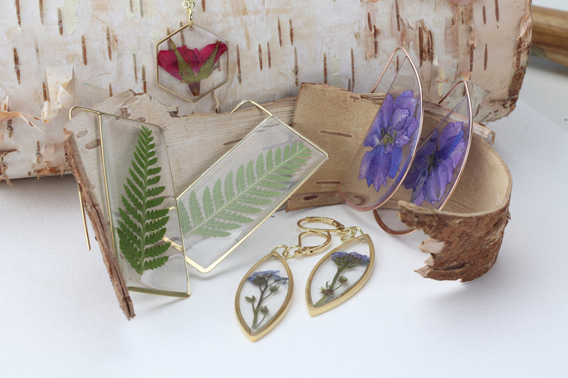 A real small blue forget-me-not flower is hand gathered, pressed and dried to be showcased in crystal clear jeweler's resin. This dainty and elegant flower is framed by a 18k gold plated triangle and attached to a shimmering 16k gold filled necklace chain.